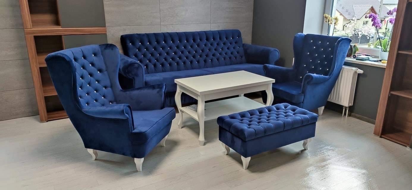 PIĘKNY DUŻY ZESTAW SOLIDNA SOFA ROZKŁADANA + 2 FOTELE USZAK + PODNÓŻEK W WYBRANYM KOLORZE Z DREWNIANYM BIAŁYMI NÓŻKAMI WZÓR PIKOWANIA OPARCIA GŁEBOKIE PIKI KARO GUZIKI