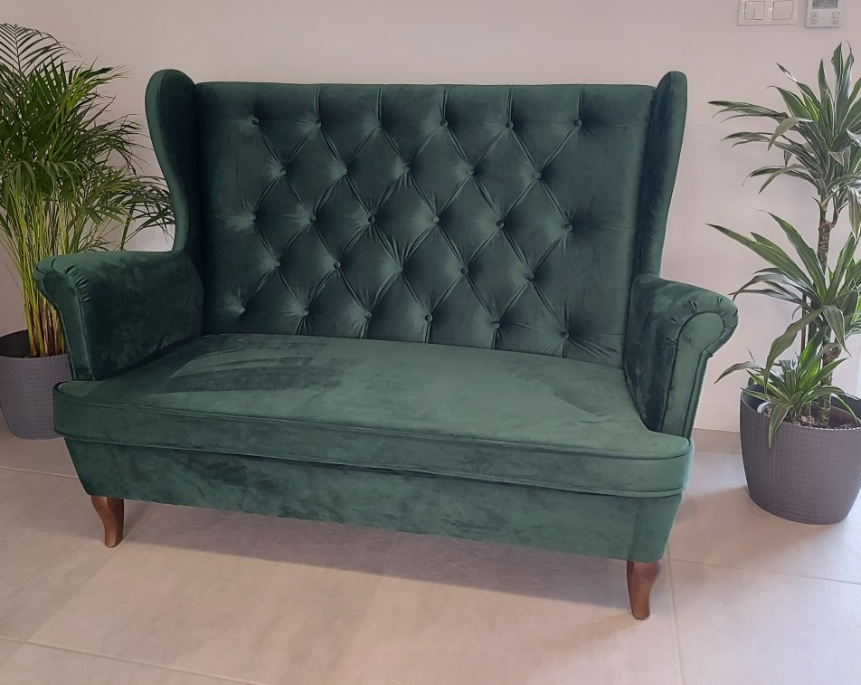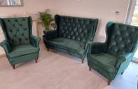 PIĘKNY DUŻY ZESTAW SKANDYNAWSKI SOLIDNA SOFA TRZYOSOBOWA NA DREWNIANYCH NOGACH LUDWIK+ 2 FOTELE USZAK W WYBRANYM KOLORZE Z DREWNIANYM NÓŻKAMI LUDWIK WZÓR PIKOWANIA OPARCIA GŁEBOKIE PIKI KARO GUZIKI