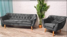 ZESTAW WYPOCZYNKOWY SOFA ROZKŁADANA + FOTEL PIKOWANY Z PODNÓŻKIEM
