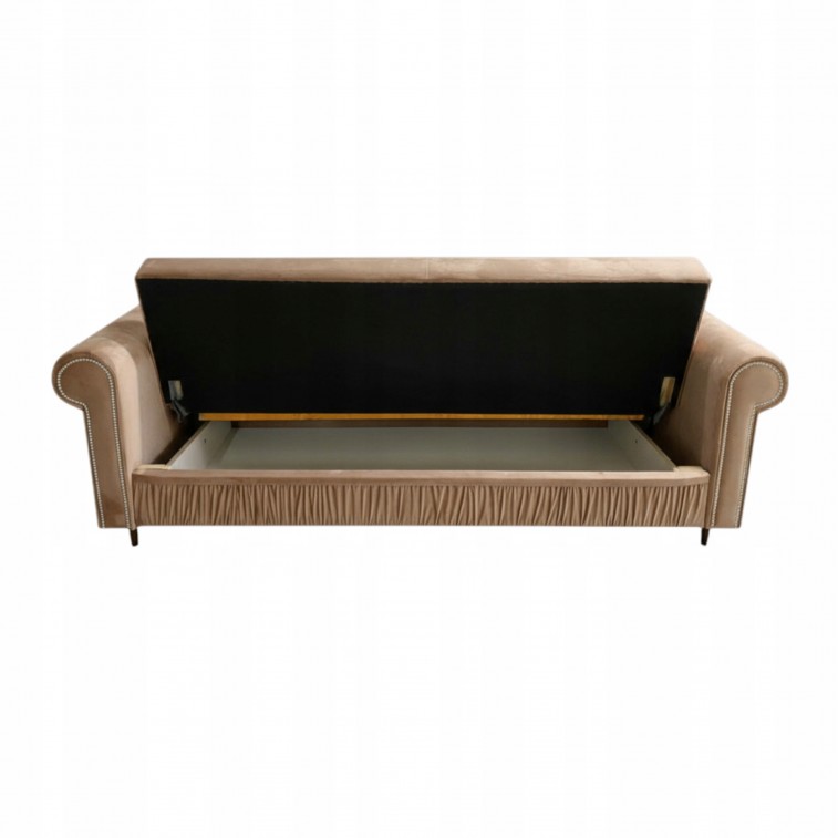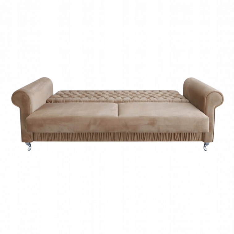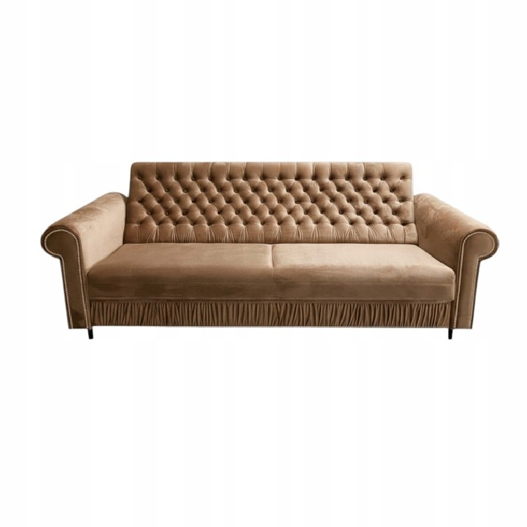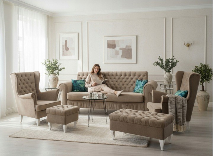 DUŻY ZESTAW WYPOCZYNKOWY SKANDYNAWSKI DO SALONU W STYLU CHESTERFIELD SOLIDNA PIKOWANA KANAPA EMMA ROZKŁĄDANA 3 OSOBOWA Z FUNKCJĄ SPANIA + 2 FOTELE USZAK + 2 PODNÓZKI ZE SCHOWKIEM W WYBRANYM KOLORZE Z DREWNIANYMI BIAŁYMI NÓŻKAMI .