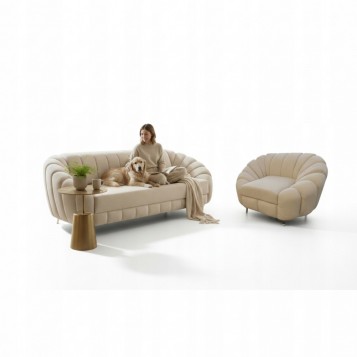 Dzięki swojemu uniwersalnemu i jednocześnie wyrazistemu designowisofa ta jest niezwykle wszechstronna w kontekście aranżacji wnętrzaŚwietnie komponuje się zarówno z nowoczesnymi i minimalistycznymi przestrzeniami, gdzie stanowi miękki akcent przełamujący surowe linie, jak i z bardziej klasycznymi czy eklektycznymi wnętrzami, wprowadzając nutę glamour i wyrafinowania Art Deco. Jej neutralna kolorystyka jest idealną bazą, która pozwala na łatwe dopasowanie dodatków. Można ją ożywić wyrazistymi poduszkami dekoracyjnymi w nasyconych barwach, geometrycznymi wzorami na dywanach lub połączyć z eleganckimi stolikami kawowymi z marmuru lub szkła, tworząc spójną i luksusową strefę wypoczynkową.