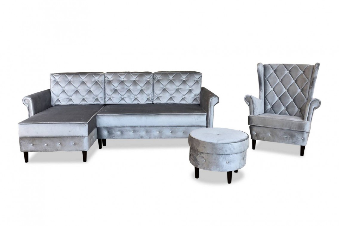 PIĘKNY DUŻY ZESTAW NAROŻNIK LILI Z FUNKCJĄ SPANIA NA DREWNIANYCH NOGACH + FOTEL USZAK +OKRĄGŁA PUFA W WYBRANYM KOLORZE Z DREWNIANYMI NÓŻKAMI WZÓR PIKOWANIA OPARCIA PIKI KARO GUZIKI