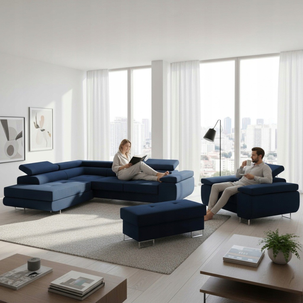 NOWOCZESNY ZESTAW WYPOCZYNKOWY ANTOS NAROŻNIK Z FUNKCJĄ SPANIA I POJEMNIKIEM + FOTEL PODNÓZKIEM ZE SCHOWKIEM W WYBRANYM KOLORZE Z METALOWYMI NÓŻKAMI