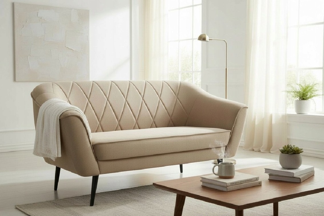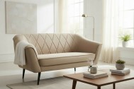SOLIDNA SOFA 2 +1 W KOLORZE BEŻOWYM Z DREWNIANYM CZARNYMI NÓŻKAMI WZÓR PIKOWANIA OPARCIA KARO GUZIKI